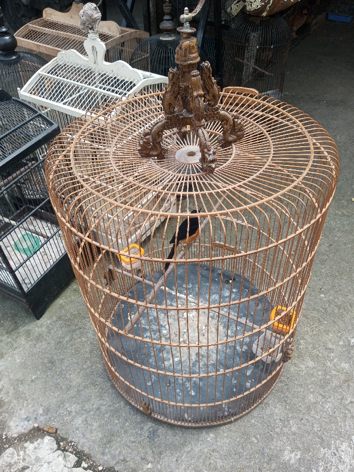 A brown, cylindrical birdcage dominates the view, housing a small black and orange bird perched on a branch. It features a decorative, dark brown, carved wooden piece on top. Surrounding the primary cage are several other birdcages in various styles and colors, including black, white, and natural wood tones. The cages are situated on a gray concrete surface. Two small yellow containers are visible on the inner walls of the birdcage.