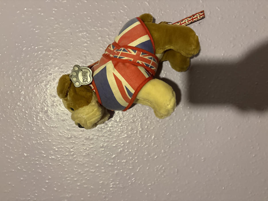 - "A brown and beige plush bulldog toy, wearing a red, white, and blue Union Flag patterned vest, is affixed to a textured, light purple wall in Oswestry, United Kingdom" by FM-RPcgE2, licensed under CC BY 4.0