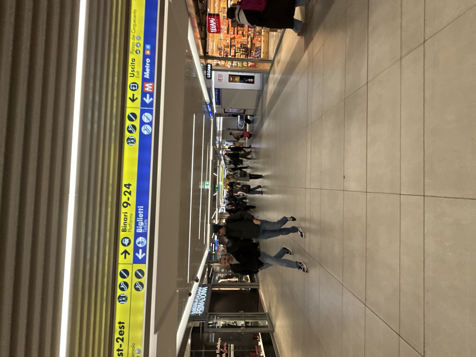 The image depicts an indoor concourse within Roma Termini train station in Rome, Italy