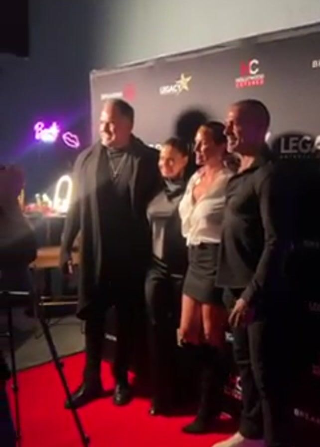 red carpet event at night. Four people pose for photos in front of a backdrop with logos. The backdrop includes "LEGACY Entertainment" and "HOLLYWOOD COVERED". A photographer with a large camera and lighting rig takes pictures. A neon sign reading "Beauty" is visible in the background. The group then walks away from the backdrop, and the video shows the outdoor event area with people and a building facade with a round window. A person with a microphone appears to be giving an interview or announcement.