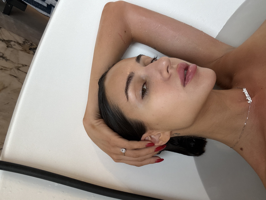 A woman reclines in a white tub, her head tilted back, eyes nearly closed. Her skin is damp and luminous. A silver necklace with the word "Selmade" graces her neck. A teardrop-shaped diamond ring adorns her left hand. Her nails are painted a deep red. The tub's edge and a glimpse of marble flooring are also visible.