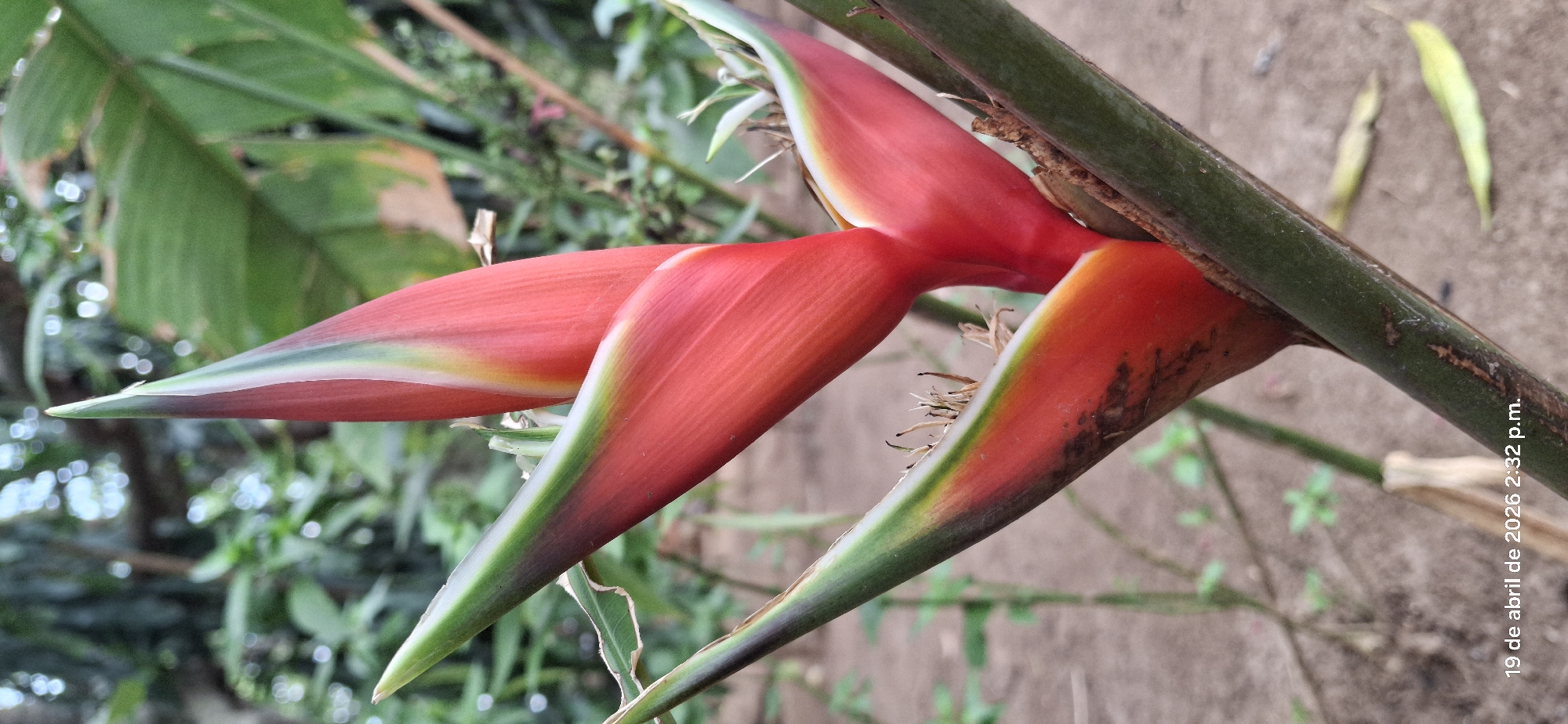 The image depicts a cluster of Heliconia flowers, characterized by their vibrant red petals with green and white accents at the tips. The flowers are attached to a sturdy green stem. The background reveals a natural setting, with blurred greenery suggesting foliage. The presence of a date stamp "19 de abril de 2026 2:32 p.m." in the lower right corner indicates the temporal context of the image. There is no indication in the image that it was taken in Vallecito, Venezuela.