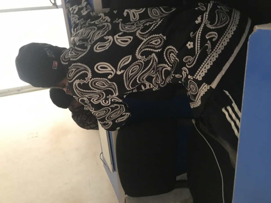 The scene is located in Calabar, Nigeria. A person is observed from behind, seated and leaning forward at a table or desk. The individual wears a black beanie, a long-sleeved black shirt with an intricate white paisley pattern, and black pants featuring two prominent white stripes on the outer leg, indicative of athletic wear. A silver or white laptop, closed, rests on a light blue table surface in front of the individual. Behind the seated person, a reflection of another individual or the same person is visible in a reflective surface on a cream-colored wall, showing a dark, possibly patterned garment. The background consists of a plain, light-colored wall with some visible discoloration or staining. The foreground includes a dark blue or black chair and a portion of a blue surface, likely part of the table.