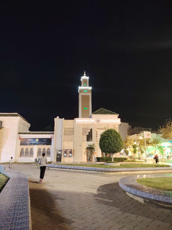 A nighttime view showcases a building with a tall, illuminated minaret. The building's facade features intricate patterns and the words "BANQUE POPULAIRE" in Arabic. A person on a scooter moves across a paved area in the foreground. A manicured lawn and trees are present in the midground. Other buildings and street lights create a lively urban backdrop. The sky is dark, with a few stars visible.
