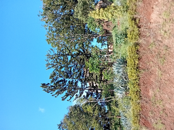 A vertical shot features a clear blue sky contrasting with lush green trees and vegetation. A brown, earthy surface stretches across the right side of the image, dotted with sparse grass. The greenery consists of various shades, creating a textured border against the sky. The trees stand tall, their branches and leaves filling the upper portion of the frame. The overall scene evokes a sense of nature and tranquility.