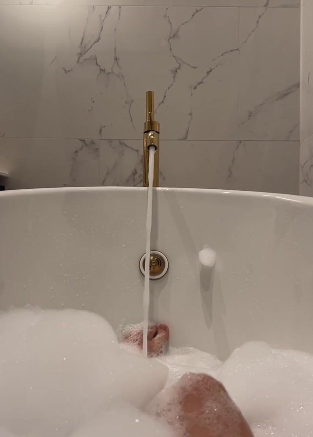 A person is relaxing in a bathtub filled with a lot of fluffy white bubbles. A gold-colored faucet is running, with a stream of water flowing into the tub. Only parts of the person's legs and feet are visible through the bubbles. The bathtub is white and the background features white marble-style tiles. A round light fixture is attached to the wall above the tub.