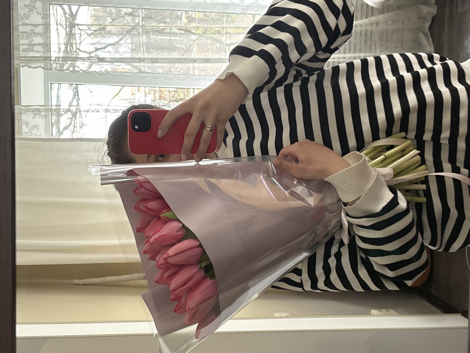 A single individual is depicted in a mirror self-portrait, captured in an indoor residential setting. While the prompt specifies Slavyansk-na-Kubani, Russia, no discernible features within the image allow for precise geographical identification of the city or a specific location within it. The subject, partially obscured, is shown from the upper torso to just below the waist. The individual wears a black and white horizontally striped long-sleeved sweater with ribbed white cuffs. Dark hair is visible at the top of the head, and one eye and eyebrow are visible above a red-cased smartphone held in the right hand. A ring is present on the ring finger of the right hand. The individual holds a large bouquet of approximately 15-20 closed pink tulips in the left arm, wrapped in a combination of translucent clear film and light purple paper, tied with a pale pink ribbon around the stems. The immediate background, reflected in the mirror, consists of a light-colored wall on the left, and a large window with white framing and sheer, light-colored lace curtains on the right. Beyond the window, the outdoor environment shows bare tree branches, indicative of a colder season. A dark wooden frame, likely belonging to the mirror, is visible at the top and left edges of the composition. A white electrical outlet or switch plate is partially visible on the wall to the left of the individual. The individual's action is taking a photograph of their reflection while holding the bouquet and smartphone.
