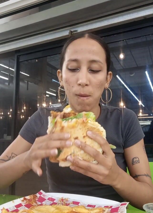 The video features a person eating a sandwich and fries. The person is fair-skinned with dark hair pulled back, wearing a gray t-shirt and large hoop earrings. They have tattoos on their forearms. They take a large bite of a sandwich, which appears to be a torta. The sandwich is tall and filled with various ingredients. A plate of fries sits in front of the person, accompanied by a small container of ketchup. The scene takes place in what appears to be a food court or casual dining area, indicated by the overhead lighting and nearby windows. The background noise suggests a public space with music or other ambient sounds.