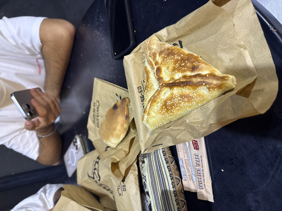 The image depicts a casual indoor dining scene at an eatery in Rishon LeZion, Israel. The location is identifiable by the "03-95" phone prefix and Hebrew text on the food packaging. A dark, speckled table serves as the primary surface. In the foreground, a large, triangular, golden-brown baked pastry, possibly a Khachapuri or large Burekas, topped with sesame seeds, rests in an open brown paper bag. To its upper left, a smaller, crescent-shaped golden-brown baked item is partially visible within another brown paper bag. Several other brown paper bags, some with Hebrew text and the "03-95" phone prefix, are distributed across the table. On the right side of the image, the forearms and torso of an individual wearing a white t-shirt and a silver bracelet are visible. This person is holding a silver smartphone (likely an iPhone) with both hands, appearing to interact with its screen. Another smartphone with a clear MagSafe case lies flat on the table, and a third black-cased smartphone is also present. To the far left, a patterned fabric item, possibly a small bag or prayer mat, with beige, brown, and blue stripes, is situated. Adjacent to this, a long, rectangular package labeled "FDC ROYAL DRESSING" with Hebrew text indicating "Garlic Sauce" is visible. Another person in a light-colored garment is partially visible on the far left.
