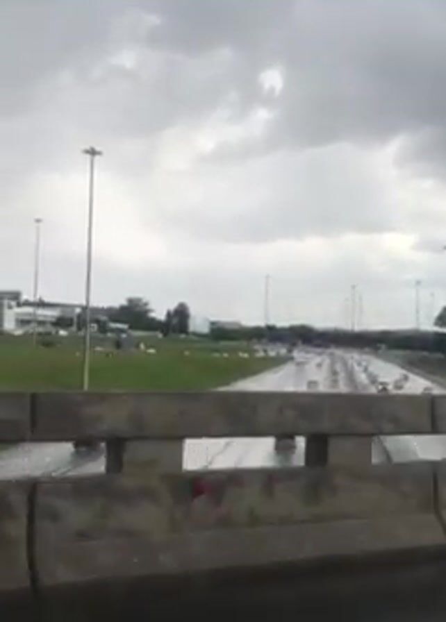 highway scene on a rainy day, likely taken from a car. The highway is busy with cars moving in both directions. In the background, there is a grassy area with a building. A utility truck drives past with the word "PHOENEIX" written on the back. The sky is overcast with heavy gray clouds.