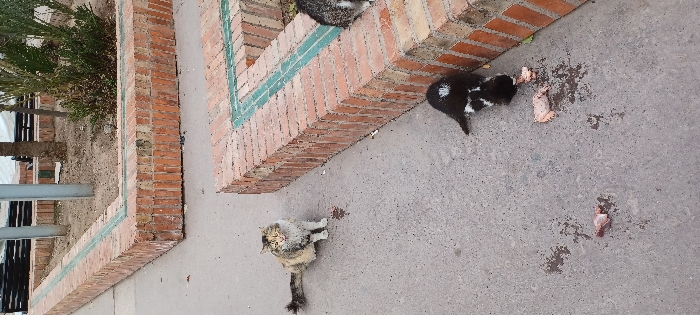 Three cats are outside near a brick planter. One cat is lying down on the concrete. Another black and white cat is eating pieces of meat scattered on the ground. Another cat appears to be on the brick planter. There are some blood spots and other marks on the concrete where the cat is eating.