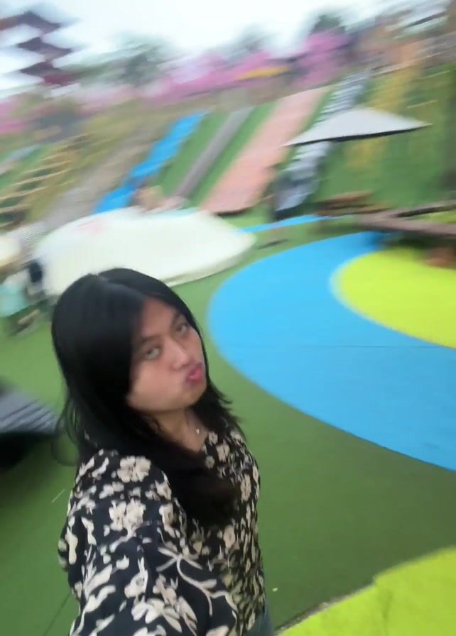 woman holding a camera and recording herself at an outdoor playground with green, blue and yellow artificial turf. The woman has long black hair, and is wearing a black and white floral shirt and jeans. She makes a funny face at the beginning, and then smiles. There are other people in the background, including children, and picnic tables and playground equipment such as slides, climbing nets and an orange tree-like structure. The area appears to be on a hill overlooking a landscape. The video appears to be a vlog or personal recording.