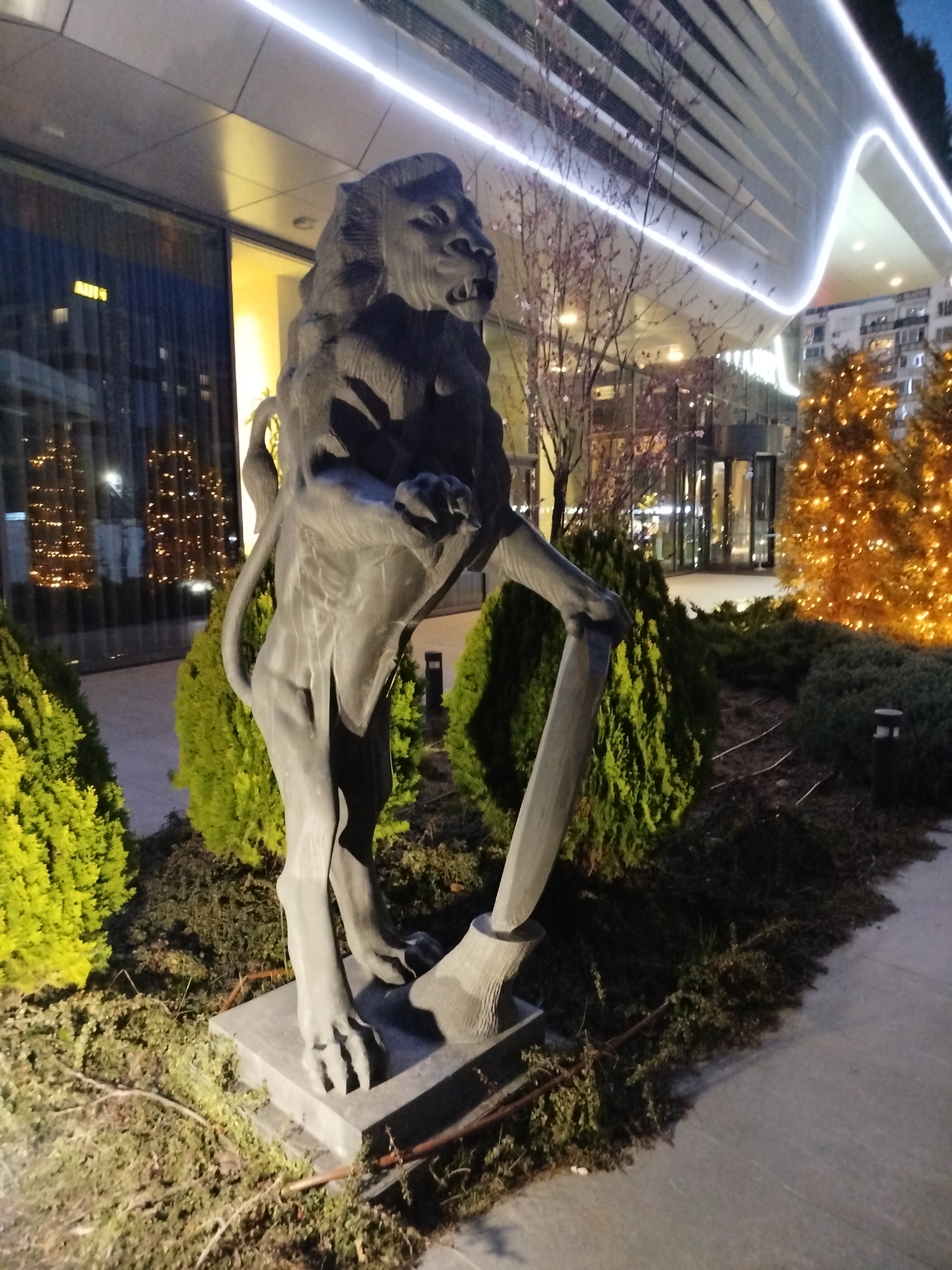 A large, dark-colored statue of an anthropomorphic lion, depicted standing upright on two legs and holding a curved, possibly sword-like object, is positioned on a light gray rectangular plinth in the foreground. The lion's mouth is open, revealing teeth, and it possesses a mane. The statue is surrounded by various types of landscaping: bright green, rounded bushes on the left and behind it, and darker, smaller ground cover with some sparse branches and fallen leaves on the ground around the base. Behind the statue, a modern building with a glass facade reflects warm interior lighting and the glow of numerous small, yellow Christmas lights on a large conifer. The building's upper structure features horizontal, curved white panels with embedded linear white lights, creating a flowing, illuminated design. Further to the right, another conifer is heavily adorned with similar yellow Christmas lights. A revolving glass door is visible in the distance, indicating an entrance to the building. The scene is illuminated by artificial lights under a dark sky, suggesting nighttime. No individuals are present in the frame. The specific city location is unknown.