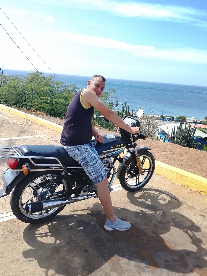 A man in a dark tank top and plaid shorts sits on an Empire motorcycle. He's wearing grey sneakers and looking at the camera with a slight smile. The motorcycle casts a prominent shadow. In the background, a beautiful ocean scene unfolds beneath a clear blue sky. Lush greenery and cacti dot the landscape behind the man and his bike. A yellow painted edge separates the concrete area where they are positioned from the natural environment.