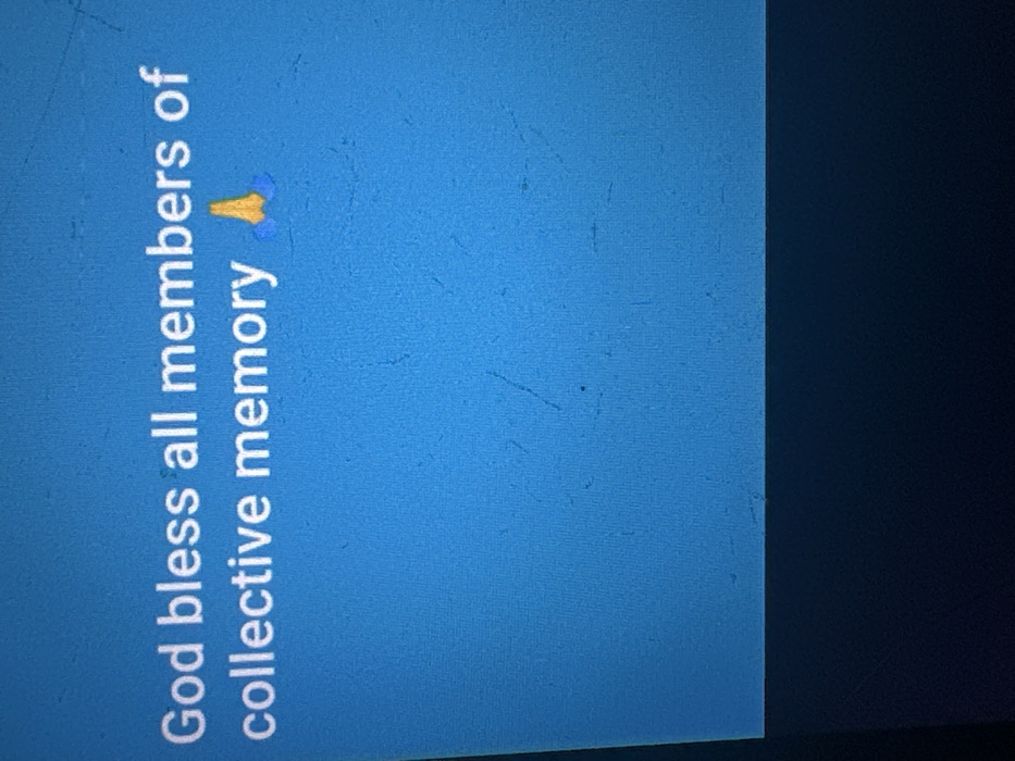 The scene, located in the city of Nnobi, Nigeria, presents a close-up view of a digital display screen. The upper two-thirds of the screen display a uniform medium-blue background. White, sans-serif text is centered on this blue field, reading: "God bless all members of collective memory". Immediately following the word "memory" is a yellow-orange praying hands emoji (🙏). The screen's surface shows multiple faint, linear abrasions and specks of dust, consistent with a physical display monitor. The bottom third of the image is occupied by a dark, unidentifiable plane, possibly a surface below the screen or the screen's lower bezel in shadow. No individuals, specific actions, or further objects are visible.