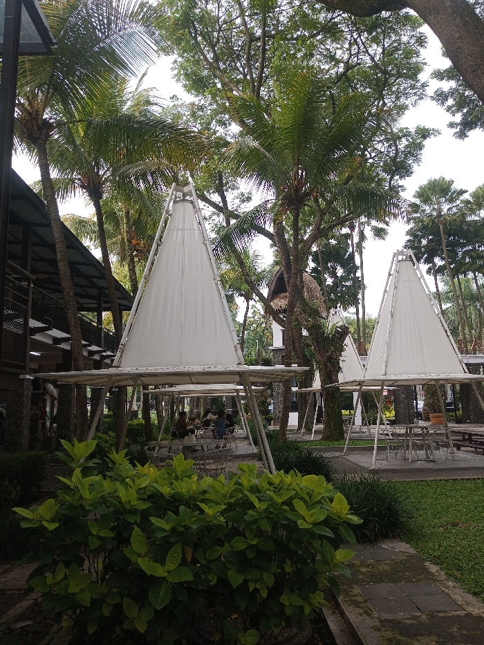 Outdoor seating is arranged under several tent-like canopies, with white fabric stretched over a frame. Tables and chairs are visible beneath each canopy. Palm trees and various other trees surround the area. Lush green bushes are at the bottom of the image. A building with a dark roof is visible on the left and another structure with a thatched roof in the background. The scene appears to be a park or garden setting.