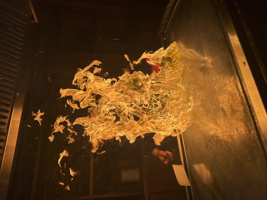 A high-angle shot shows flames engulfing an unknown object in what appears to be a metallic enclosure. Bright yellow and orange flames dominate the image, obscuring the object at the center. A hand is visible near the bottom right corner, holding a white rectangle. The enclosure features metallic surfaces with linear patterns, casting reflections of the fire. The background is dark, emphasizing the intense glow of the flames.