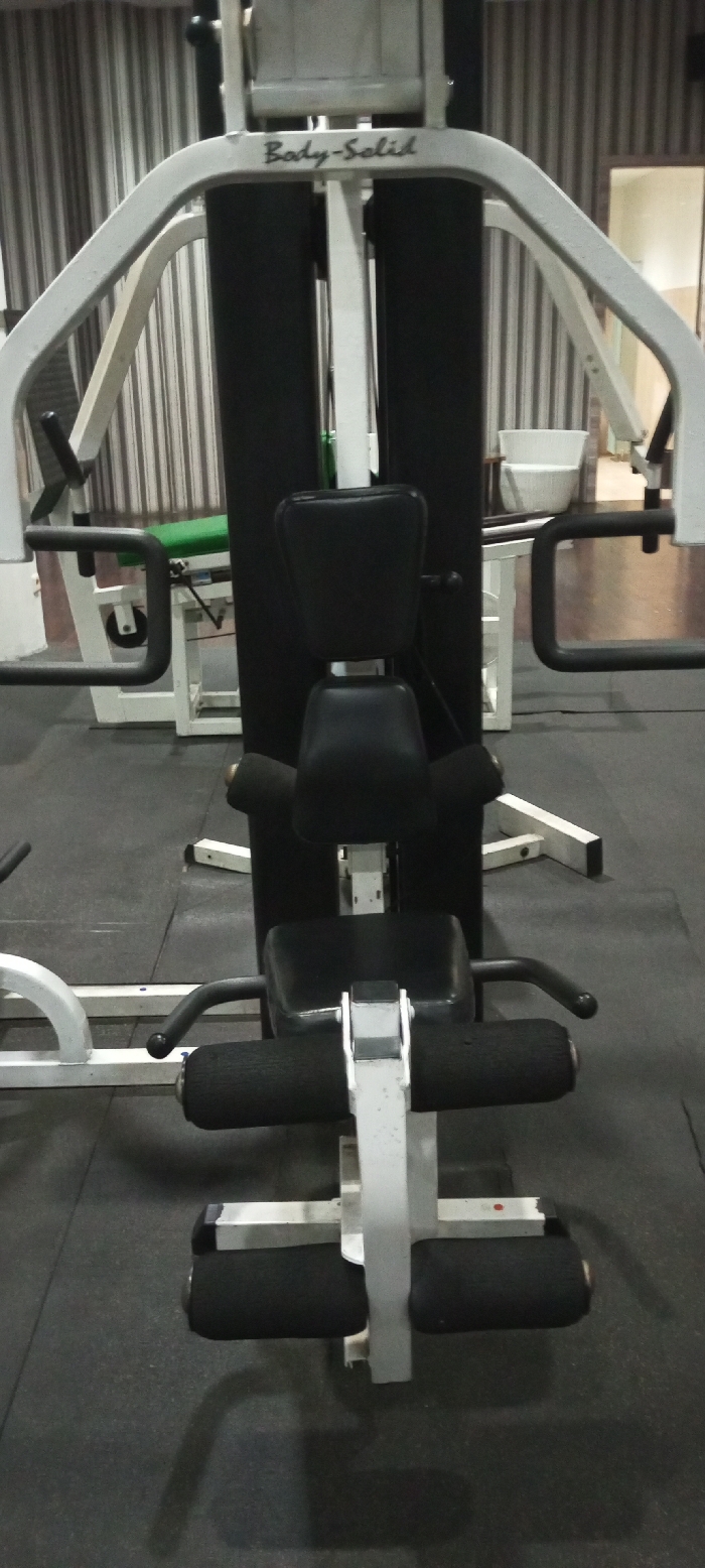 The scene depicts the interior of a gymnasium, located in the city of Aral, Kyrgyzstan. The primary subject is an unoccupied "Body-Solid" branded multi-gym machine, constructed with a white metal frame and black upholstered pads for the seat, backrest, and lower leg rollers. This machine features components for chest press/pec fly exercises and a leg extension/curl station. In the background to the left, another piece of white-framed gym equipment with a green padded bench is partially visible. To the right background, a white bucket or container is present near a doorway with a light-colored frame. The floor is covered with dark grey or black rubber matting. The background wall features vertical light-colored paneling or stripes. No individuals are present in the image, and the equipment appears to be in functional condition.