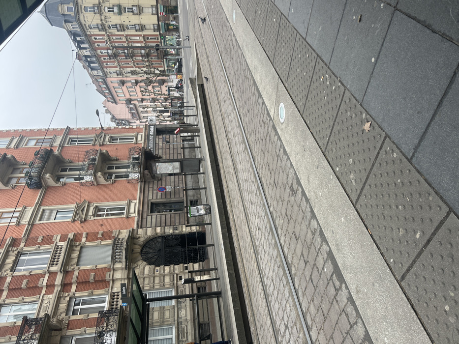This image captures a wide-angle view of the tram tracks and a city street at Place de la République in Strasbourg, France, under an overcast sky. In the immediate foreground, a dark grey tiled sidewalk with sections of light grey tactile paving containing raised dots is visible. A circular, flush-mounted light fixture is embedded in the light grey section. To the left, the edge of a dark grey tram shelter with a green roof is partially visible. The midground features two sets of tram tracks laid into a cobblestone surface. A raised, light grey concrete tram platform runs parallel to the tracks on the left. Black metal railings line the edge of this platform. Scattered on the cobblestones are three pigeons. A partially visible person wearing blue pants stands near the tram shelter on the far left. On the tram platform, a green and white public waste bin and a black information panel are present, along with a small red and white sign on a pole. A blue circular sign with a red diagonal line through it (no stopping/parking) is affixed to another pole. The background is dominated by multi-story buildings. On the left, a prominent reddish-orange brick building with ornate decorative stone elements, white-framed windows, and several black wrought-iron balconies is visible. Its ground floor features a large, arched black metal entrance and a sign for "RESTAURANT AKABE," with another sign for "Laverie" nearby. Further down the street to the right, a row of older European-style buildings with varied facades in shades of pink, cream, and yellow line the street, featuring numerous windows and some with mansard roofs. Leafless trees are interspersed along the street. Vehicles are parked and moving in the distance, and a green cross pharmacy sign is visible on one of the buildings. The overall scene suggests a quiet, daytime urban setting.