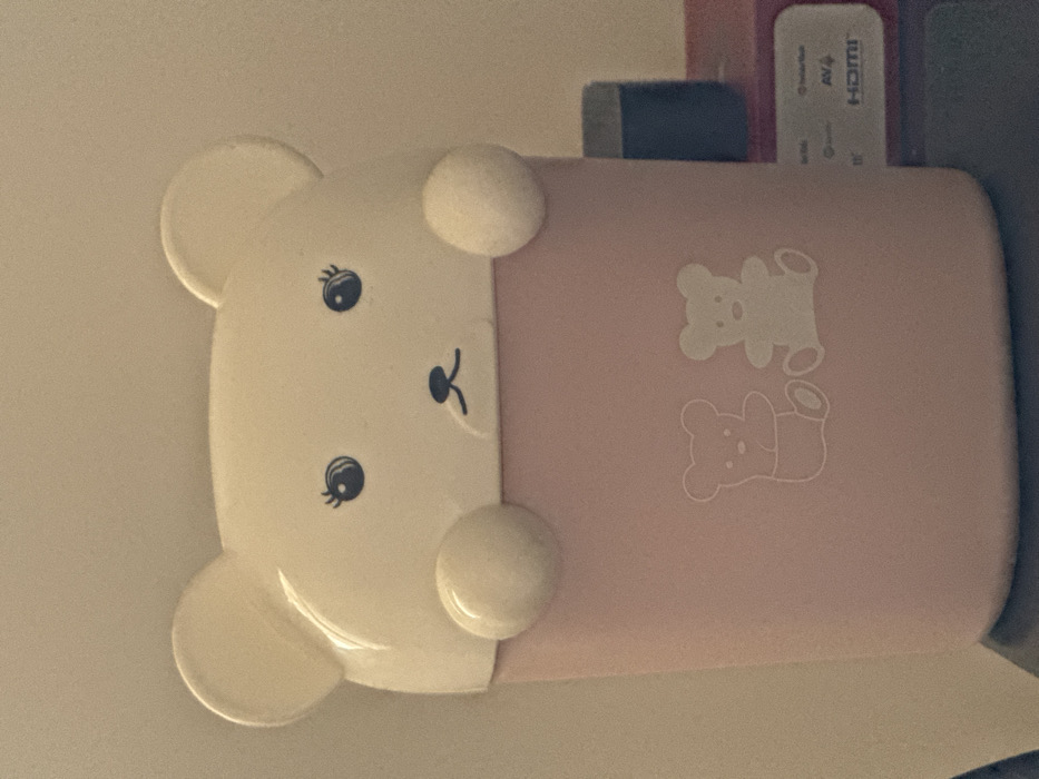 A cream-colored, bear-shaped container with a pink base is prominently displayed, centered in the frame. The upper portion, molded like a bear's head, features two black circular eyes with stylized eyelashes, a small black "x"-shaped nose/mouth, and two spherical protrusions resembling paws on either side. The lower, cylindrical portion of the container is pink and adorned with two white teddy bear illustrations: one a solid silhouette and the other an outline. The container rests on a dark, flat surface. To its right, partially visible, are a dark rectangular object and a red electronic device with visible "HDMI" labeling and other unidentifiable text. The background consists of a plain, light-colored wall or surface. The scene is static, devoid of people or visible actions. The location is in the city of Unknown, Unknown.