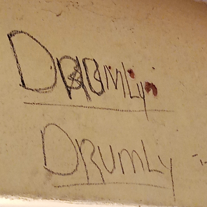 A light-colored, textured surface, located in the city of Tuaniako, Nigeria, displays two lines of handwritten text in dark, thick strokes, indicative of graffiti. The upper line, partially obscured, reads "DRUMLy", with the 'U' appearing to be scribbled over. Three small, irregular reddish-brown smudges are present near the 'M' and 'L' of the upper text. A thin, wavy line is drawn underneath this upper inscription. The lower line clearly spells "DRUMLY" in capital letters, also underlined by a similar thin, wavy line. The writing medium appears to be a crayon, charcoal, or similar soft marking tool. The background surface shows minor discoloration and speckling. No individuals or other significant objects are visible in the scene.