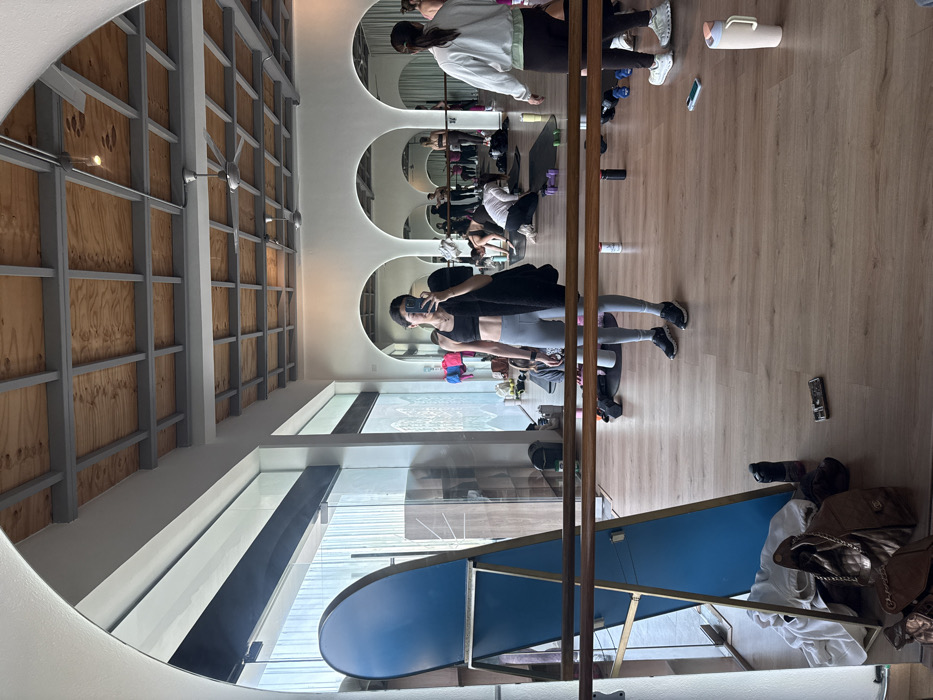 A fitness studio interior is reflected in a large, round mirror. Several people are exercising. A woman in athletic wear is taking a selfie in the mirror. The ceiling has exposed wooden beams. A floor-to-ceiling window overlooks a sunny outdoor area. A blue-paneled divider and personal belongings are near the mirror's base.