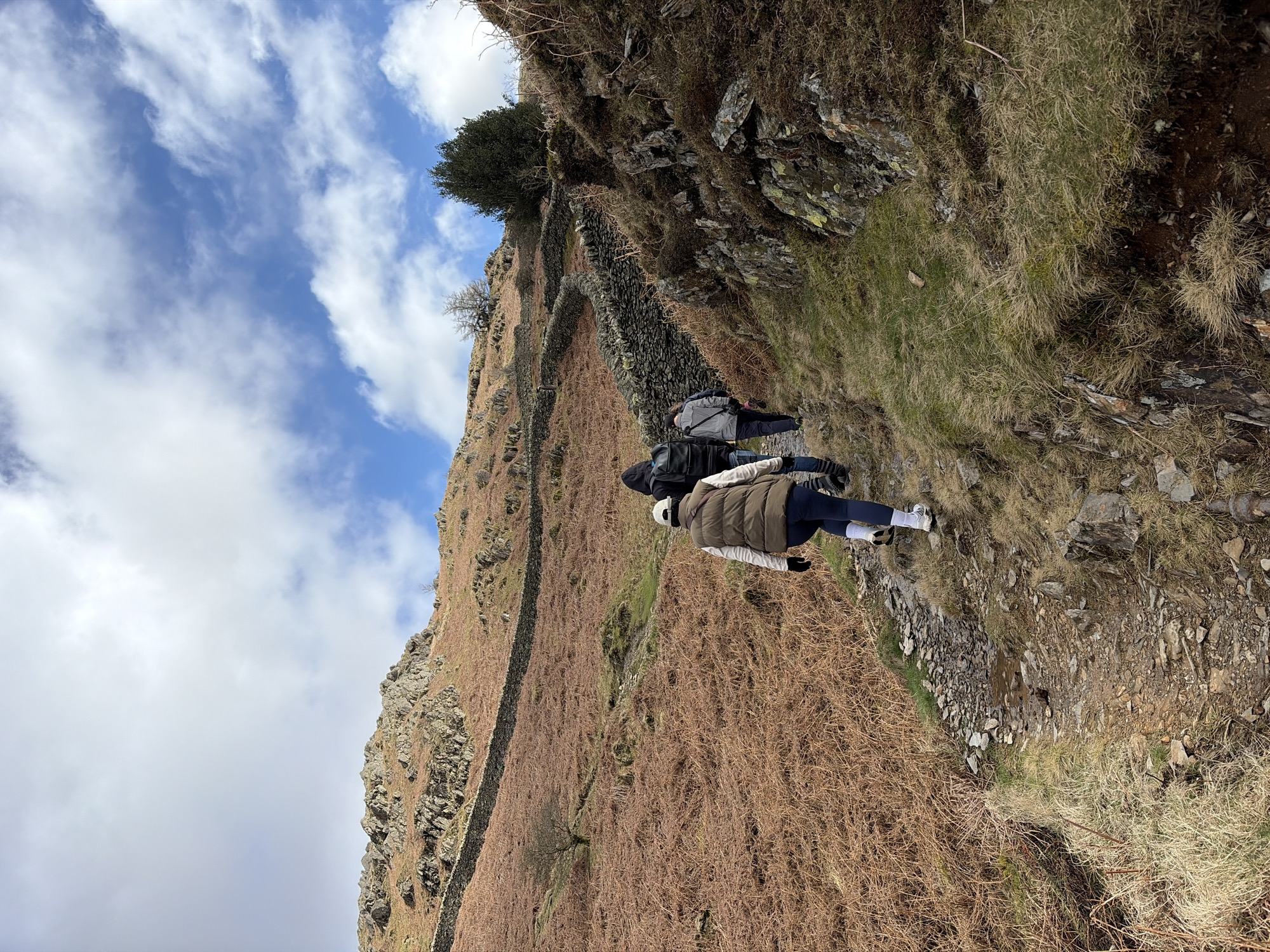 The image depicts four individuals hiking uphill on a narrow, rocky dirt path through the fells near Grasmere, United Kingdom. The path ascends a moderate slope with sections of wet ground and small puddles. The lead hiker, closest to the camera, wears a white baseball cap, a light brown puffer vest over a dark top, dark blue trousers, white socks, and white trainers, carrying a dark shoulder bag. Behind this person, a second individual wears a black hooded jacket or backpack and dark trousers. A third hiker is visible in a grey jacket and dark trousers, followed by a fourth, partially obscured figure in dark attire. All individuals are walking away from the viewer, moving up the path. To the left of the path, the hillside is predominantly covered in dense, dry, reddish-brown bracken and some patches of green grass. A dark grey dry stone wall runs diagonally up the hillside, separating the lower slopes from higher terrain, and a small, bare tree stands further up the left slope. To the right of the path, the terrain is rockier with scattered patches of dry grass, heather, and moss. A larger, dark evergreen tree or bush is situated on the right hillside in the mid-ground. The sky above is partly cloudy with large white clouds against a clear blue background. The overall environment suggests a rugged, open landscape typical of the Lake District fells.