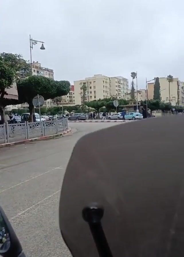 street scene from the perspective of someone on a motorcycle. The camera is behind the windscreen of the motorcycle, and the left-side mirror is visible in the lower-left corner. The view is across a street and pedestrian area. There are several buildings in the background of various heights and colors, with some trees lining the street. A prominent building, the Volubilis Hotel, stands on the right side of the frame. A man is pulling a cart across a crosswalk in the street. A green trash container sits on the edge of the sidewalk. The sky is overcast.