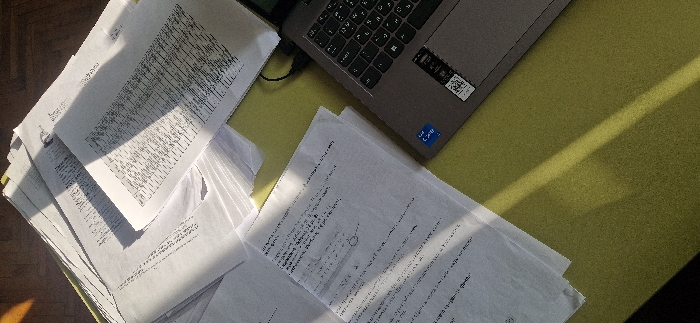 The scene depicts a desktop setup located in Dupnitsa, Bulgaria. On a light green mat, several stacks of white paper are arranged. The uppermost papers display printed text, including what appears to be a list or table on one sheet and paragraphs on another. To the right, a grey laptop is partially visible, oriented with its keyboard and trackpad facing the viewer. An Intel Core i3 sticker is affixed to the laptop's palm rest. A power cable connects to the left side of the laptop. The background to the upper left features a brown, possibly wooden, surface. Strong, diagonal sunlight illuminates sections of the papers and the green mat, casting defined shadows across the items. No individuals are present in the image, and no active interactions or actions are depicted.