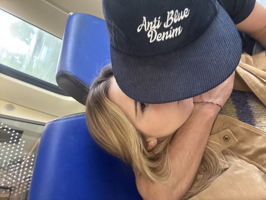 An image captured inside a train carriage in Vught, Netherlands, depicts two individuals in close proximity. The scene is dominated by a young female positioned on the left, her blonde hair visible, with her left eye, eyebrow, and part of her cheek discernible. She wears a small stud earring in her left ear and is dressed in a tan-colored outer garment, possibly a jacket, over a striped inner layer with blue, green, and brown tones. Her head is angled, resting or leaning. To the right, partially obscuring the female's lower face, is a male individual whose face is entirely concealed by a dark blue corduroy baseball cap. The cap features "Anti Blue Denim" embroidered in white script on its front. His right arm is visible, extended around the female's neck/shoulder area, with his hand near her throat. A thin red string bracelet is present on his right wrist. The immediate environment consists of blue upholstered train seats with darker headrests. Through the train window on the right, an outdoor landscape with green foliage and a body of water is visible. Another window section to the left displays a decorative pattern of white cross shapes.