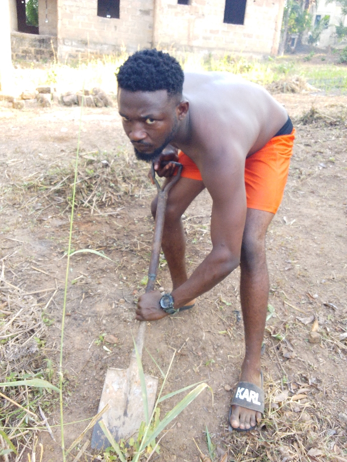A man with dark hair and a beard is shown outdoors, shirtless and wearing bright orange shorts, digging with a shovel. He looks directly at the camera with a stern expression. He wears a watch on his left wrist and black sandals with "KARL" printed on them. The ground is dry and covered with grass and weeds. In the background is a building with visible windows. The overall impression is one of physical labor.