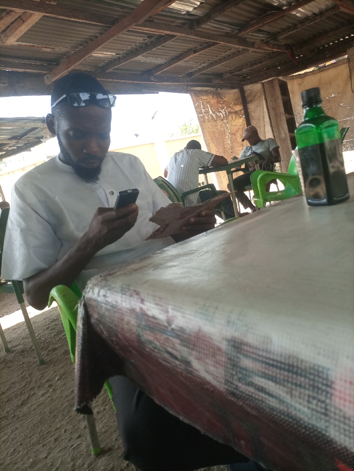An outdoor or semi-enclosed seating area in Adankolo, Nigeria, is depicted under a corrugated metal roof supported by wooden beams. The ground is unpaved dirt. In the foreground, a man with dark skin, a short beard, and sunglasses resting on his head wears a white tunic. He is seated on a green plastic chair at a table covered with a patterned, woven plastic material. He holds a black smartphone in his left hand and a stack of banknotes or papers in his right hand, looking down at the phone. To his right, on the table, stands a dark green glass bottle with a black cap, containing a dark liquid. In the midground, two other men are seated at a separate table, also on green plastic chairs. One man, seen from the back, wears a striped shirt. The other, further right, wears a light-colored shirt and a baseball cap. Both are looking downwards. A makeshift wall constructed from light-colored fabric or tarp is visible in the background, to the right of the seated men.