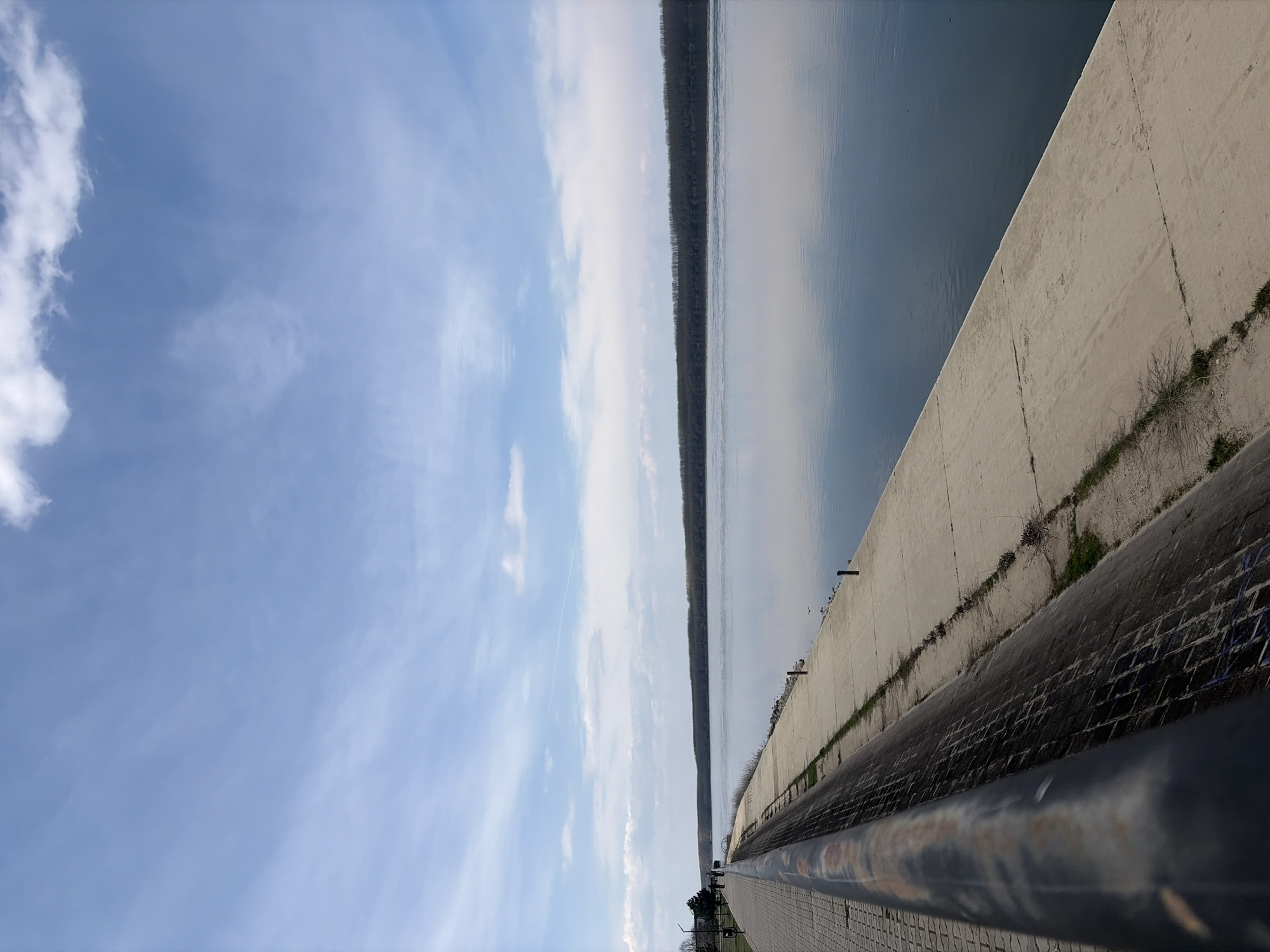 The image captures a riverside scene along the Danube River in Lom, Bulgaria, under a partially cloudy blue sky. A dark, weathered metal railing occupies the immediate foreground, extending diagonally from the lower left towards the middle right. Behind the railing, a paved promenade composed of light-colored rectangular pavers stretches into the distance along the riverbank on the left. Parallel to the promenade, a textured concrete embankment wall slopes down, meeting a flat concrete path at the water's edge. Sparse green vegetation grows in the cracks of this lower concrete path. The Danube River occupies the central and right portions of the frame, presenting a calm, reflective, dark blue-grey surface that mirrors the sky. On the distant right bank, a dense, horizontal band of bare deciduous trees forms a dark silhouette against the horizon. Several indistinct human figures are visible walking along the paved promenade in the mid-distance on the left. The scene is illuminated by natural daylight, casting subtle shadows.