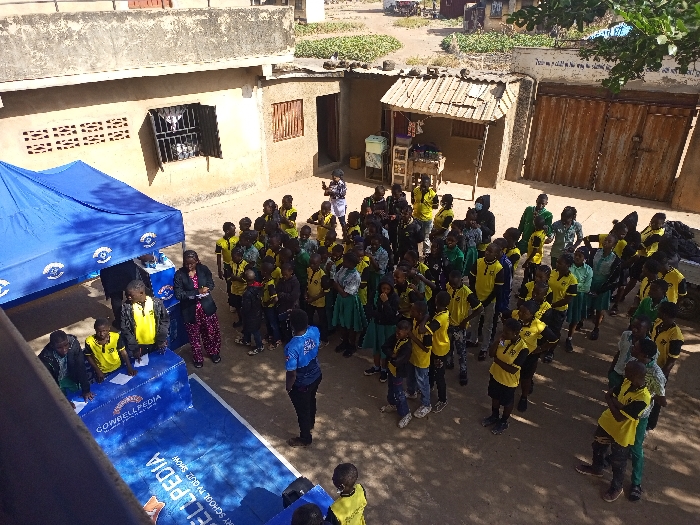 An outdoor scene in Sabon Tasha, Nigeria, depicts a gathering of approximately 50-60 individuals, predominantly children, within an open dirt/concrete courtyard surrounded by single-story residential or commercial structures. The structures feature light-colored walls, some exposed brick, barred windows, and corrugated metal roofs. In the foreground, a blue canopy tent with "COWBELL" branding and an eye-and-star logo covers a portion of the area. Adjacent to the tent, a blue raised platform is visible with "COWBELLPEDIA" and "MATHS QUIZ SHOW" branding. Three children are positioned behind this platform, and several adults are nearby, including one female in a patterned dress and another male in a blue "COWBELLPEDIA" branded shirt who is facing the assembled crowd. The majority of the children are clustered in the central and right portions of the image, facing towards the blue platform and the adults. Many children wear yellow and black shirts, while others are in green and white school uniforms. Shadows are cast by the surrounding buildings and individuals, indicating bright daylight. In the background, a small, open-fronted kiosk or stall with various items is visible, alongside large metal gates. An individual is visible near the buildings in the far background, appearing to observe or record the event.