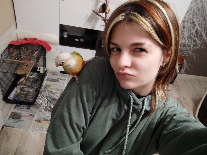 The image captures an indoor scene in the city of Hadzhidimitrovo, Bulgaria. A young adult female, with multi-toned hair featuring prominent blonde and reddish-brown highlights, is shown from the chest up, wearing a dark green hooded sweatshirt. She has an earring with a pearl-like bead in her right ear and is looking directly at the camera with a slight pouting expression. Perched on her left shoulder is a small parrot, identified by its white head, green back, and orange-red belly, with its head slightly tilted downwards. To the left of the individual, a large black metal birdcage containing various toys and wooden perches is visible. A red cloth is draped over the upper left corner of the cage. The floor beneath and surrounding the cage is covered with several sheets of newspaper. White cabinetry is present in the upper left background. To the right of the individual, a dark-colored shelf or cabinet is visible, along with a decorative branch-like wall fixture and a portion of a patterned wall covering.