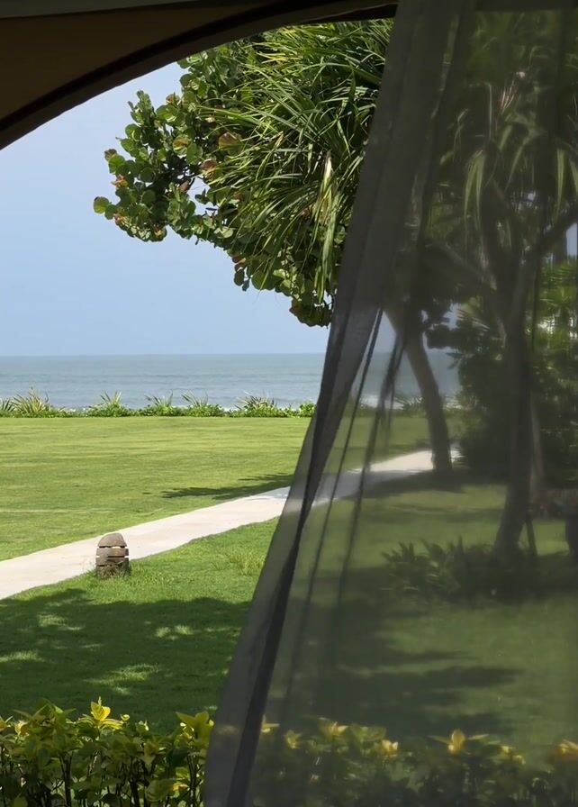 The shot is taken from inside a shaded area, possibly a porch or gazebo, looking out onto a vibrant green lawn leading to the ocean. A white pathway cuts through the grass towards the sea. Two prominent trees stand on the lawn, casting shadows on the ground. The ocean is visible in the background with a clear blue sky. A sheer curtain hangs on the right side of the frame, slightly obscuring the view.