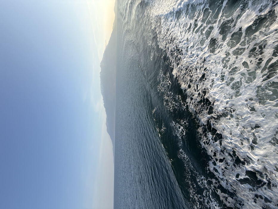 The scene depicts a marine environment near Palaiopoli, Greece. In the foreground and mid-right, a prominent white wake of churned water extends, indicating the passage of a vessel. The majority of the midground consists of dark blue-green sea water with visible surface ripples. Across the horizon, a large landmass featuring mountains with subtle lighter-colored peaks is present. The sky above is clear blue, with a faint yellowish glow on the far right, suggesting either sunrise or sunset. No people or specific objects beyond the natural environment and vessel wake are visible.
