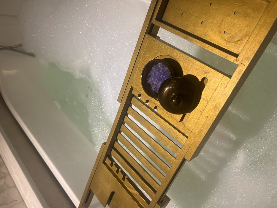 A white bathtub, partially visible, is filled with water and white foamy bubbles. A golden-colored, slatted bath caddy extends across the top of the tub. On the right side of the caddy, a small, dark metallic container holds numerous purple crystalline bath salts. The container's matching dark metallic lid is placed adjacent to it. The bathtub is situated against a light-colored wall, possibly tiled or marble. The scene is located in a bathroom in Patong, Thailand. No individuals are depicted, and no specific establishment within Patong is identifiable from the visual information.