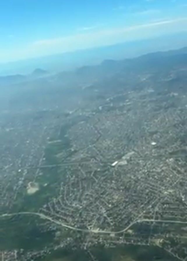 The video presents an aerial view of a sprawling urban landscape under a bright, blue sky with scattered clouds. Hazy conditions obscure the horizon, where several mountains can be seen. The city below is densely populated with buildings and infrastructure. Green spaces, including parks and wooded areas, are interspersed throughout the city. A network of roads and highways cuts through the urban sprawl. The camera is moving slightly, suggesting it is likely filmed from an aircraft.
