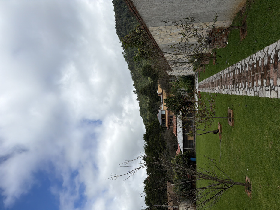 A sideways view reveals a scenic landscape. The sky is partially cloudy, transitioning to blue. A wooded hillside rises next to a structure with a stone facade. A path of stone and brick meanders through a green lawn. Sparse trees dot the landscape along the path. The buildings are residential, with red tile roofs and various architectural details.