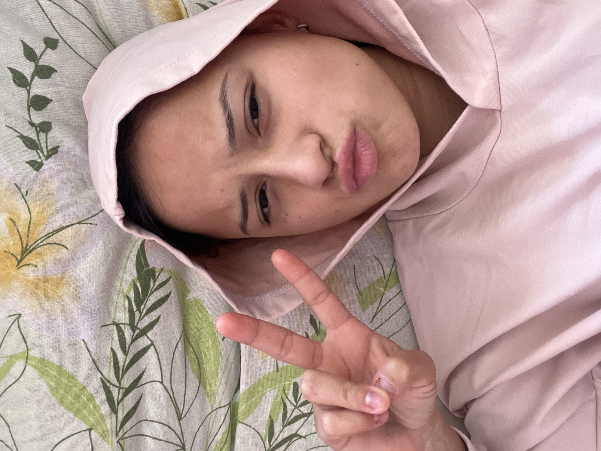 A single female individual is depicted in a close-up, overhead perspective, positioned against a patterned textile, indicating an indoor setting. She is wearing a light pink hooded sweatshirt with the hood pulled over her head. Her left hand is raised into the frame, forming a V-sign with the index and middle fingers extended. Her facial expression consists of pursed lips and slightly narrowed eyes. A small, silver-colored hoop earring is visible in her right earlobe. The background textile is light-colored, patterned with green leaves and yellow floral designs. The specific location within the city of Balgarin, Bulgaria, cannot be determined from the visual information provided.