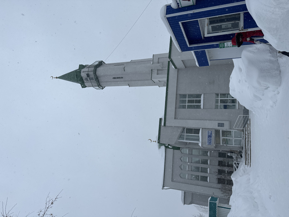 The image displays an exterior view of Mosque No. 20, located at Mirnaya Street, 10, Kazan, Russia, under conditions of active snowfall. The central subject is a modern, light grey mosque building featuring a prominent, tall minaret with a green conical roof and a golden crescent moon finial. A smaller golden crescent adorns the main mosque roofline. The building exterior is primarily light grey with green trim along the roof edges. An address plaque reading "Мирная ул., 10" is affixed to the wall near the central glass double doors, which are accessed by a short staircase with white railings. To the right of the mosque is a smaller, single-story structure with blue vertical ribbed siding, appearing to be a kiosk or utility building. Its door is ajar, and a green sign with "9-17" visible is affixed to its exterior. Heavy snow accumulation and large snowdrifts are present across the foreground and surround both buildings, indicating significant snowfall. A narrow path appears to have been cleared leading towards the mosque entrance. Fine snow particles are visible in the air, confirming the ongoing precipitation. One individual, dressed in a red hooded jacket, is partially visible in the lower right, positioned near the blue structure. This person is actively engaged in shoveling snow with a dark-colored shovel. Bare tree branches are partially visible in the upper left corner of the frame. The sky is overcast and light grey.