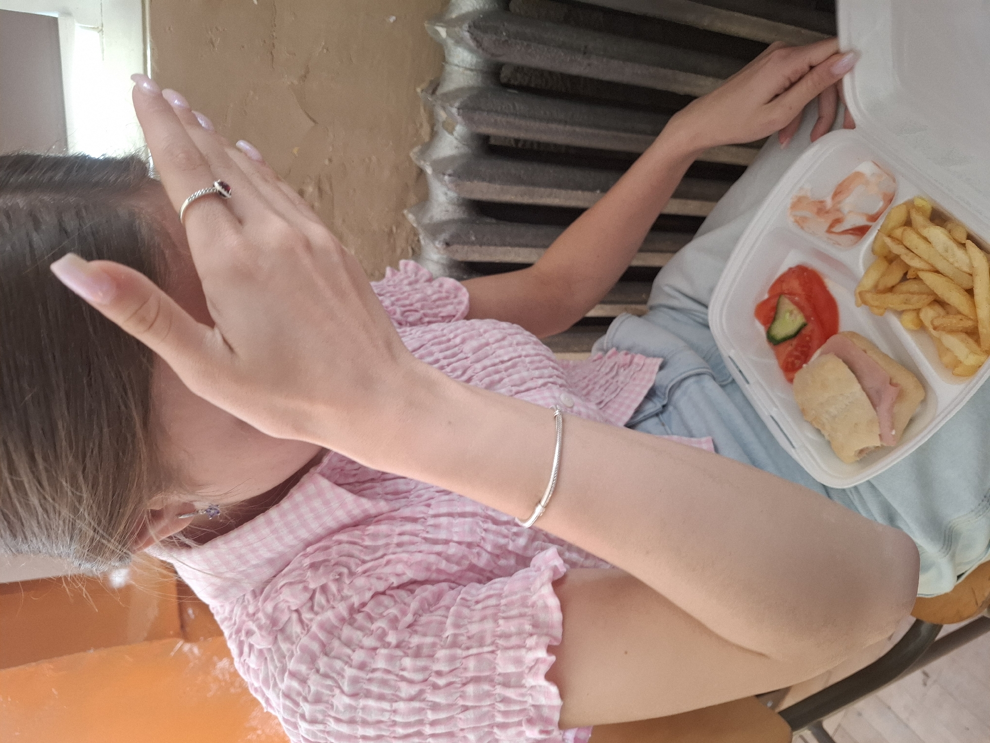 A medium shot depicts a person, likely female, seated indoors in Panagyurishte, Bulgaria. The individual's head is turned slightly to the left, with their right hand raised, partially obscuring their face. They wear a pink and white gingham, ruched short-sleeve top and light blue jeans. A silver ring with a dark, possibly red or purple, stone is present on the right ring finger, and nails are long with a pale, possibly pink or clear, manicure. A silver-colored, twisted bracelet is on the left wrist. A small, lavender-colored, flower-shaped earring adorns the visible left ear. In the foreground, a white, multi-compartment disposable foam container holds a meal. The compartments contain a small sandwich with ham, a single slice of red tomato topped with a cucumber slice, a portion of french fries, and a small cup with a red sauce, likely ketchup, exhibiting some swirl patterns. The background features a grey, cast-iron radiator on the right, positioned against a light brown or beige wall that shows signs of wear or peeling paint. An orange surface is partially visible on the far left, along with a segment of a wooden chair. The environment suggests an older interior setting.