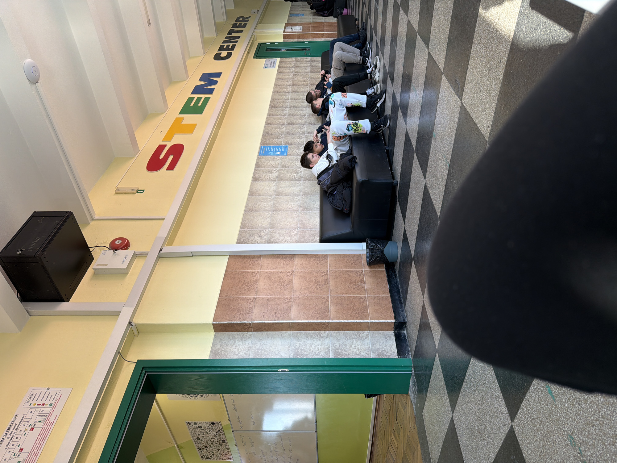 The image depicts the interior of a building, likely a school or educational institution, identified by a sign as the "STEM Center." Located in the city of Panagyurishte, Bulgaria, at "Tsar Osvoboditel" 1, according to a sign. Along the wall, the words "STEM CENTER" are painted in a colorful, linear fashion. There are four young people sitting or reclining on a black sofa in the hallway. The floor is a checkered pattern of black and gray/white tiles. The walls are a combination of yellow and brown tiling. A green door and a fire alarm system with a red bell are also visible. One trash can.