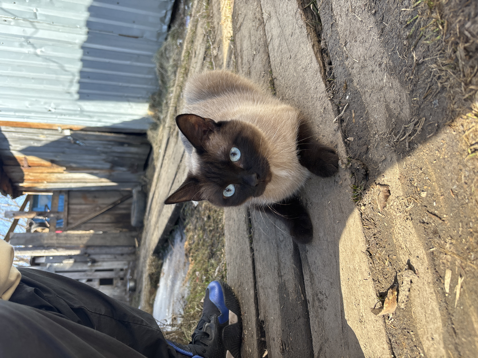 A Siamese cat sits on weathered wooden planks. A person's leg and shoe are visible in the lower left corner. The cat gazes upward, its bright blue eyes prominent. Behind the cat and person, there's a weathered wooden building or fence, and corrugated metal. Debris and dirt are scattered around the wooden planks. The location is not explicitly identifiable as Osa, Russia, from the image alone.