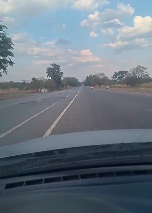 view from inside a car, driving on a paved two-lane road under a sky with scattered clouds