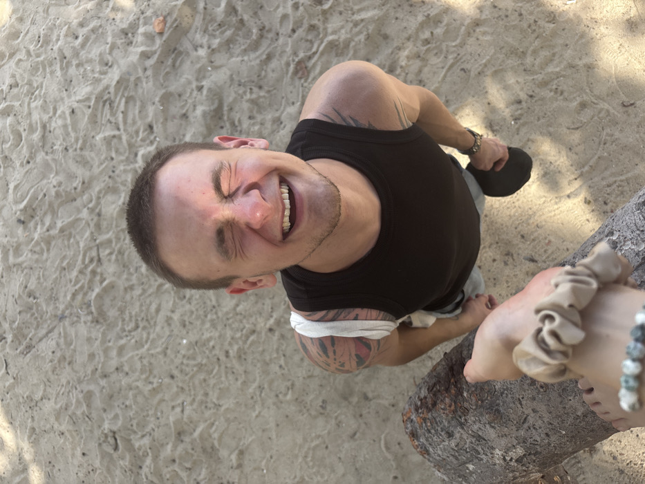 The image presents a high-angle view of a fair-skinned male subject on a sandy surface, consistent with a beach or open sandy area in Nha Trang, Vietnam. The male, with short brown hair, is looking upwards directly at the camera, eyes closed tightly, and mouth open in a wide laugh. He wears a black tank top and light-colored shorts, partially visible. A dark baseball cap is held in his left hand, and a multi-link bracelet is on his right wrist. Tattoos are visible on both shoulders and upper arms, with a distinct patterned design on his right shoulder. A white garment is draped over his right shoulder. In the lower left foreground, a bare foot belonging to a second individual is visible, resting atop a textured brown log or tree trunk. This foot features a beige scrunchie-like accessory around the ankle area and a multi-beaded bracelet on the visible wrist/lower arm. The sandy ground exhibits subtle ripples and scattered small debris. Strong, direct overhead lighting illuminates the scene.