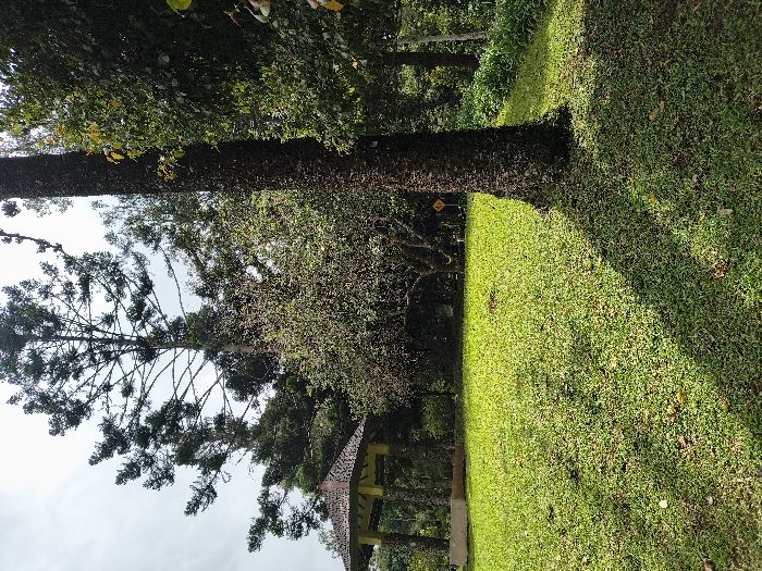A lush green landscape features a large, textured tree trunk in the center of the frame. The tree casts a shadow over the vibrant grass. In the distance, a small gazebo-like structure is partially visible. The surrounding foliage includes a mix of trees with varying shades of green, creating a natural and serene environment. The sky appears overcast, providing diffused lighting to the scene.