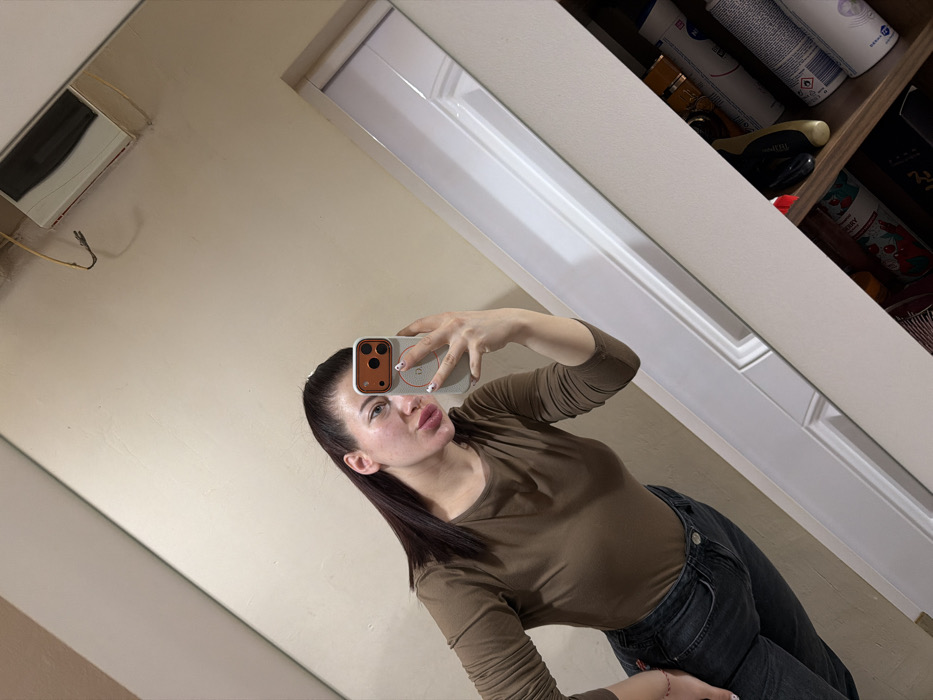 A female individual is depicted in a mirror selfie within an indoor setting. The individual, an adult female with dark hair pulled back, is wearing a long-sleeved brown top and dark-colored jeans. Her right hand holds a smartphone, encased in a light-colored cover with an orange circular magnetic accessory, directed towards the mirror. Her left hand is partially visible, resting on her hip. Her facial expression exhibits a pout with slightly parted lips. The mirror reflects a plain, light-colored wall. Positioned high on the wall, a white rectangular ventilation unit is visible, accompanied by a yellow cable and a disconnected wire. To the right of the individual's reflection, a white door or doorframe is partially visible. Below this, a section of a wooden shelving unit containing various personal care items, including aerosol cans and bottles, is reflected. The specific location within Nova Zagora, Bulgaria, cannot be determined from the visual evidence provided in the image.