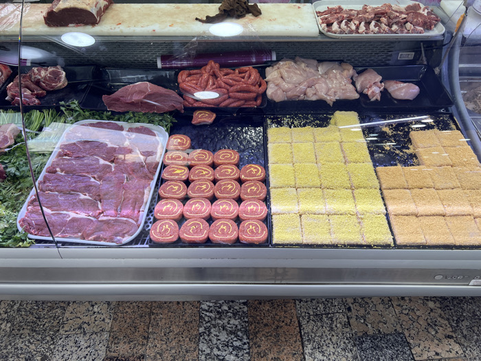 This image depicts the interior of a refrigerated display case within a commercial establishment in the city of Meknes, Morocco